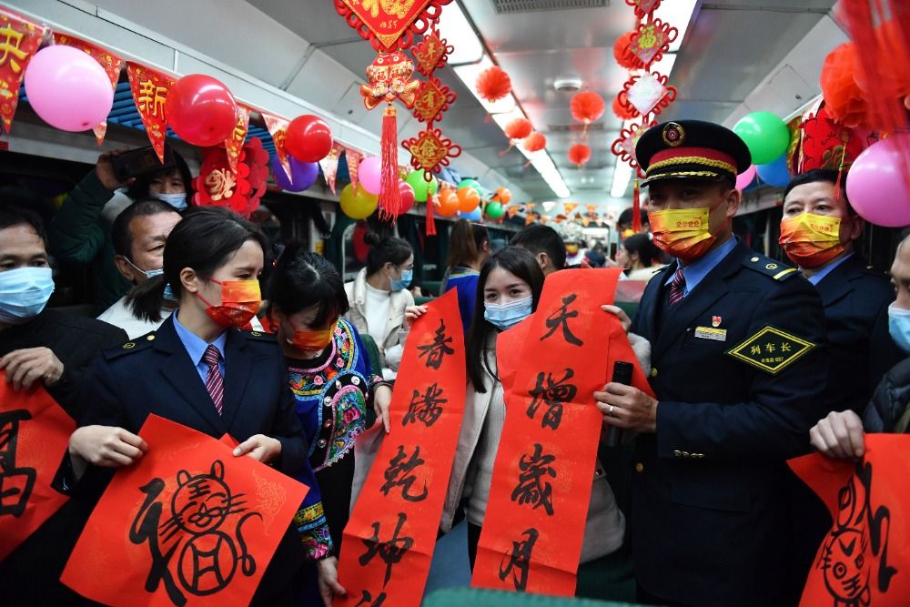 1月26日,列車乘務(wù)員向旅客贈(zèng)送對(duì)聯(lián)。 新華社記者 陳振海 攝