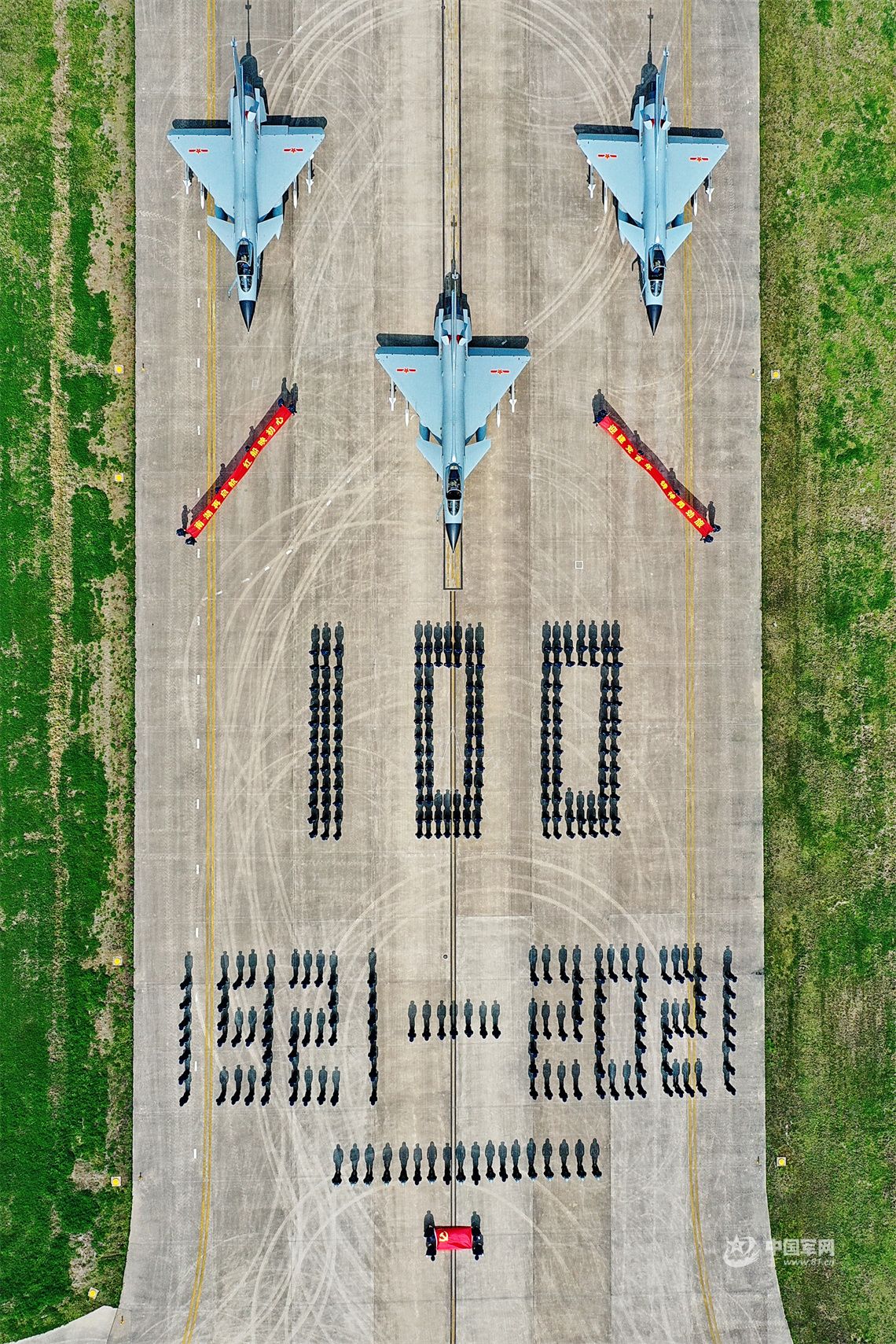 二是構(gòu)圖完美。這幅圖片采用了對(duì)稱性的構(gòu)圖法則,對(duì)稱中又有變化,給人美的視覺(jué)沖擊力。畫(huà)面上,處處顯示其平衡性。3架新型戰(zhàn)斗機(jī),成穩(wěn)定的三角形排列。一面紅色的黨旗和兩幅紅色的標(biāo)語(yǔ),又構(gòu)成一個(gè)穩(wěn)定的三角形;一組數(shù)字,同樣呈現(xiàn)三角形。由此,整個(gè)畫(huà)面顯得端莊、穩(wěn)重、大氣,與其表現(xiàn)的主題緊密呼應(yīng)。