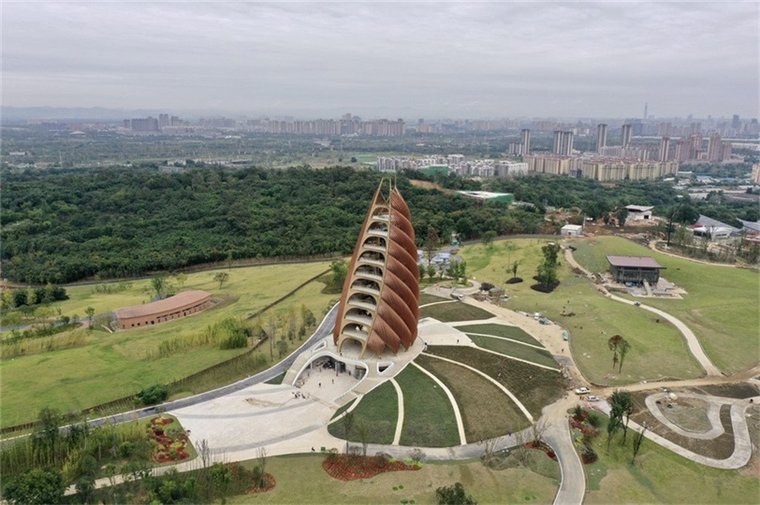 鳥瞰成都熊貓基地的瞭望塔——“春筍塔”。(成都大熊貓繁育研究基地供圖)