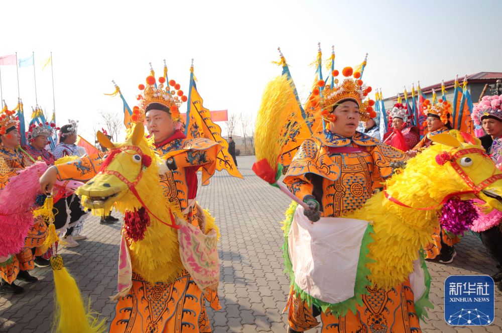 ↑2月9日,山東省無棣縣觀音堂村的群眾在排練竹馬。新華社發(fā)(高士東攝)