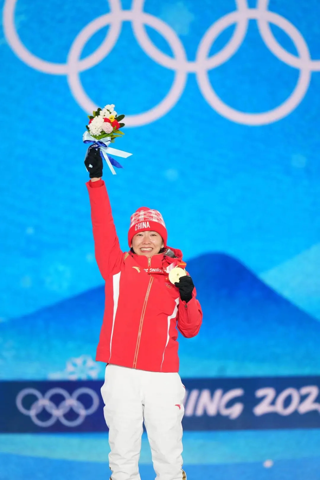戴上獎(jiǎng)牌,手拿花束