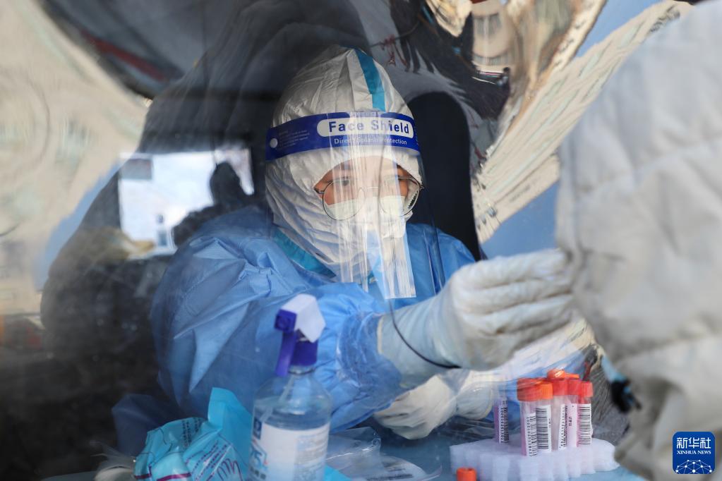 1月27日,在黑龍江綏芬河市一處核酸采集點,醫(yī)護人員對居民進行核酸采樣。新華社記者 徐凱鑫 攝