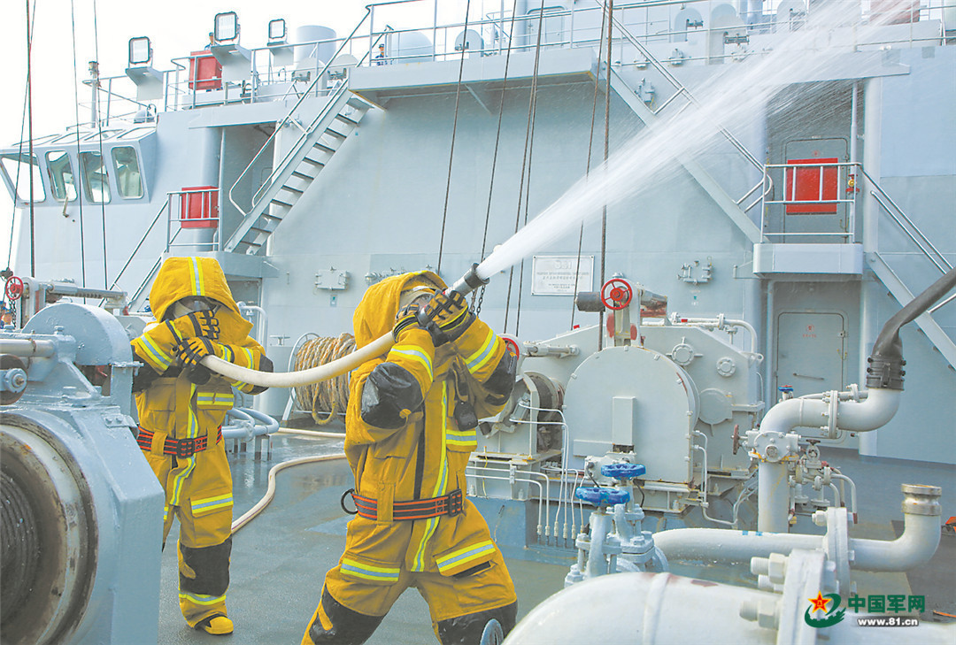 圖③:損管隊(duì)員開展滅火訓(xùn)練考核。