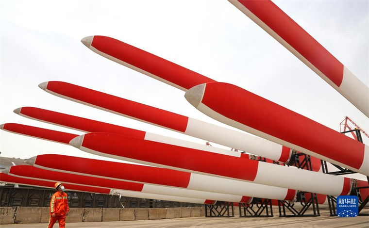 風(fēng)力發(fā)電機葉片在江蘇連云港港碼頭等待裝船外運(2021年4月16日攝)。新華社發(fā)(王春 攝)