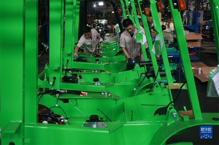 在位于江蘇靖江的江蘇中力叉車有限公司,工人在生產(chǎn)“油改電”叉車(2021年6月12日攝)。新華社記者 季春鵬 攝