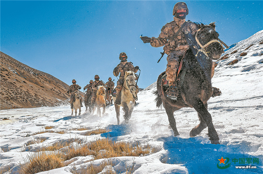 圖①:早春,新疆軍區(qū)波林邊防連官兵踏雪巡邏。