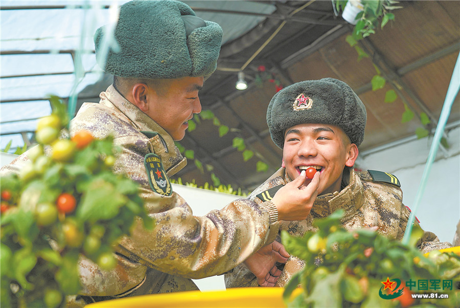 圖②:海拔5380米,神仙灣哨所官兵在新式保溫棚內(nèi)品嘗新鮮果蔬。劉曉東、黃飛皓攝