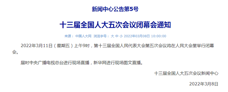 2022年3月11日(星期五)上午9時(shí),第十三屆全國人民代表大會(huì)第五次會(huì)議將在人民大會(huì)堂舉行閉幕會(huì)。