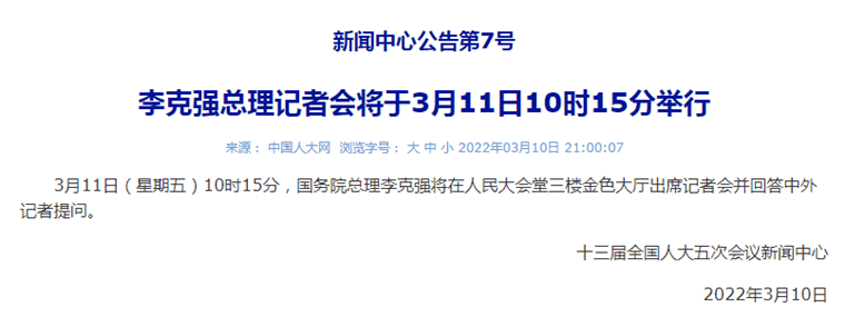 李克強總理記者會將于3月11日10時15分舉行