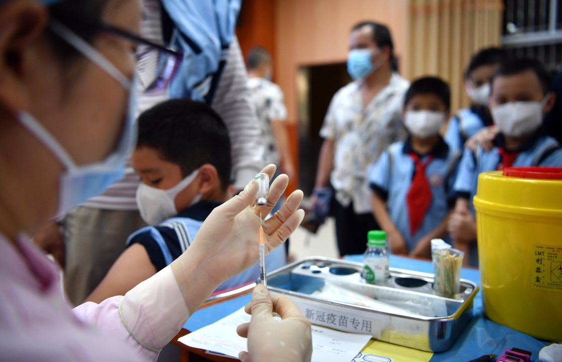 醫(yī)護人員在海口市瓊山第三小學為學生接種疫苗(2021年10月28日攝)。新華社記者 郭程 攝