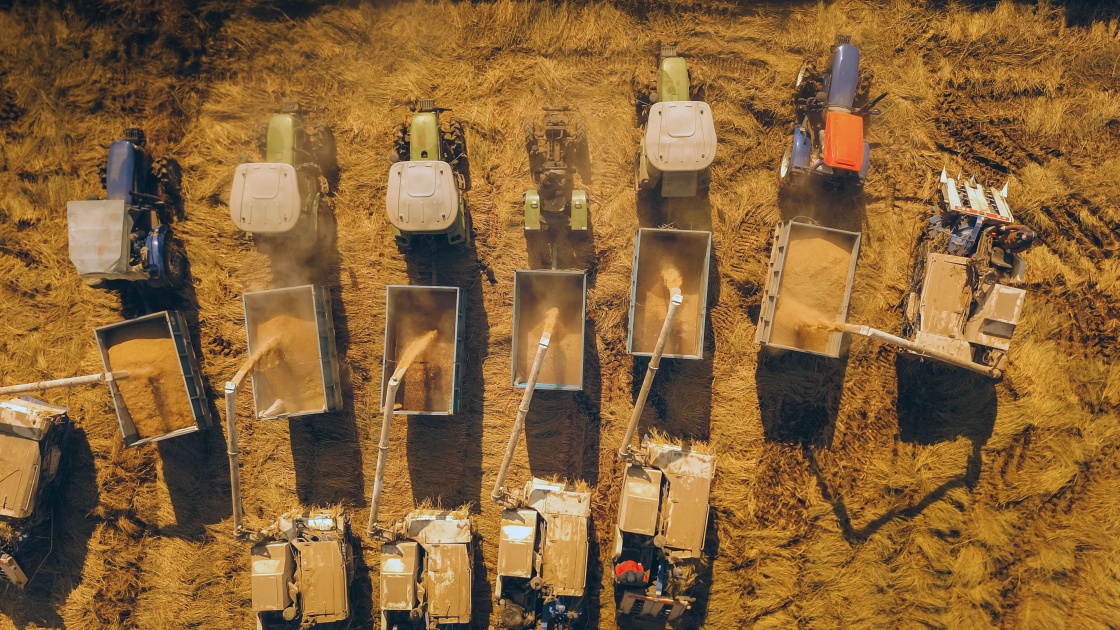 在遼寧省鐵嶺市鐵嶺縣新臺(tái)子鎮(zhèn)西三家子村,萬(wàn)鑫水稻種植專(zhuān)業(yè)合作社把機(jī)械化收割下來(lái)的水稻裝車(chē)(2021年10月20日攝,無(wú)人機(jī)照片)。新華社記者 楊青 攝