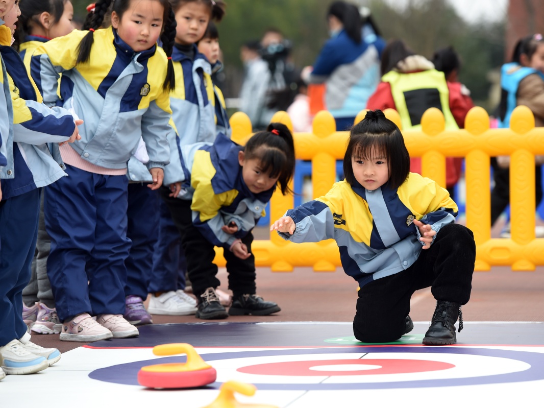 安徽省合肥市泰山路幼兒園的小朋友在開(kāi)學(xué)典禮上體驗(yàn)“旱地冰壺”游戲(2月16日攝)。新華社記者 周牧 攝