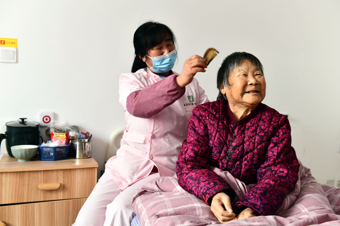 在山東省日照市嵐山區(qū)黃墩鎮(zhèn)“如康家園”殘疾人之家,工作人員為老人梳頭(3月1日攝)。新華社記者 郭緒雷 攝