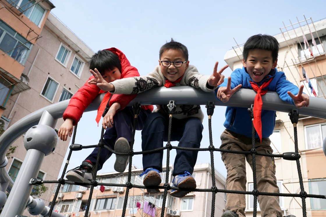 在上海市徐匯區(qū)凌云街道凌云新村社區(qū),放假的孩子們?cè)谝黄鹜嫠#?月18日攝)。新華社記者 劉穎 攝