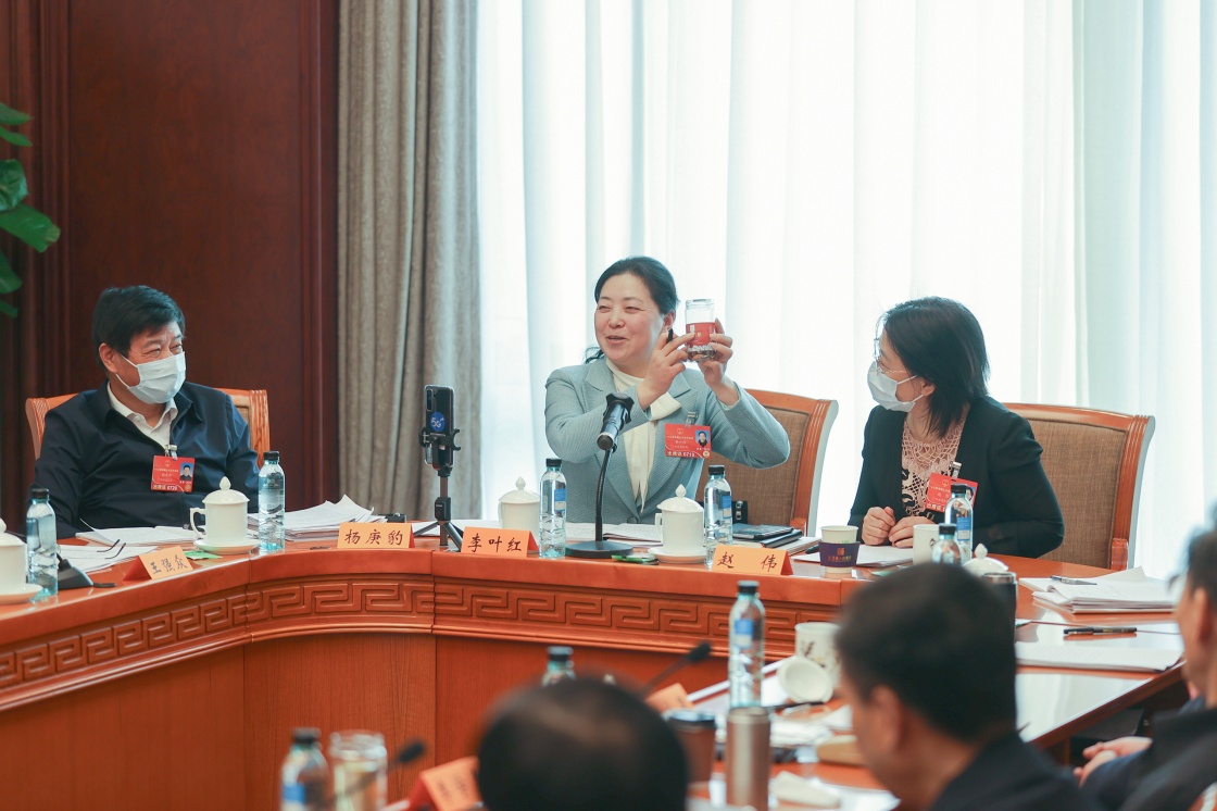 全國(guó)人大代表李葉紅在代表團(tuán)分組審議發(fā)言時(shí)向大家展示當(dāng)?shù)匾M(jìn)的新品種碧根果。新華社記者 施雨岑 攝