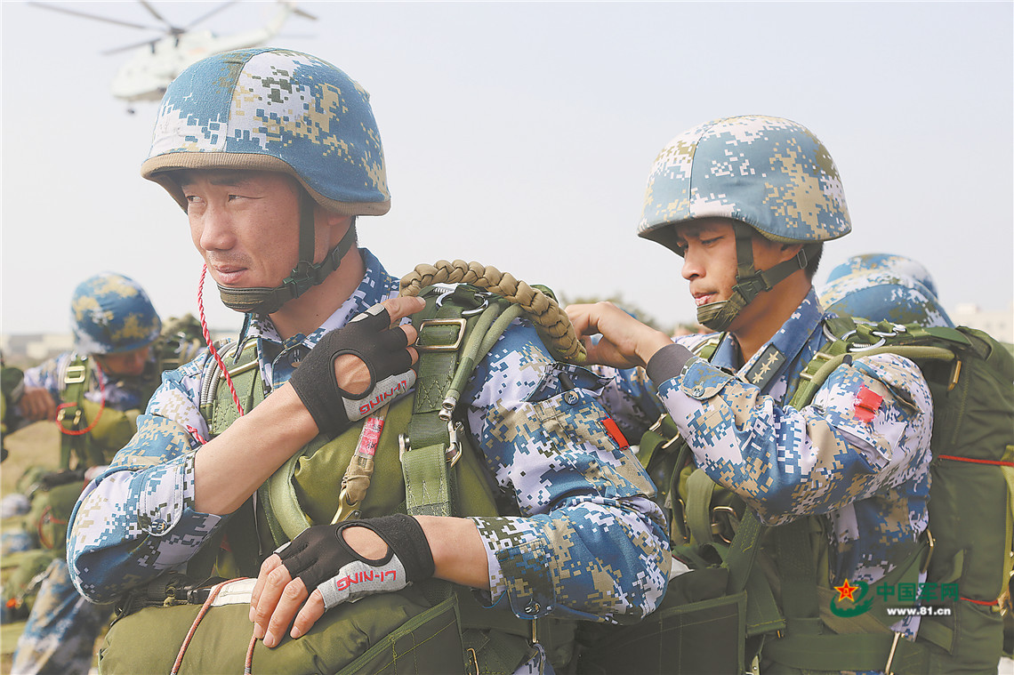 訓(xùn)練開始前,參訓(xùn)隊(duì)員相互檢查傘具背掛情況
