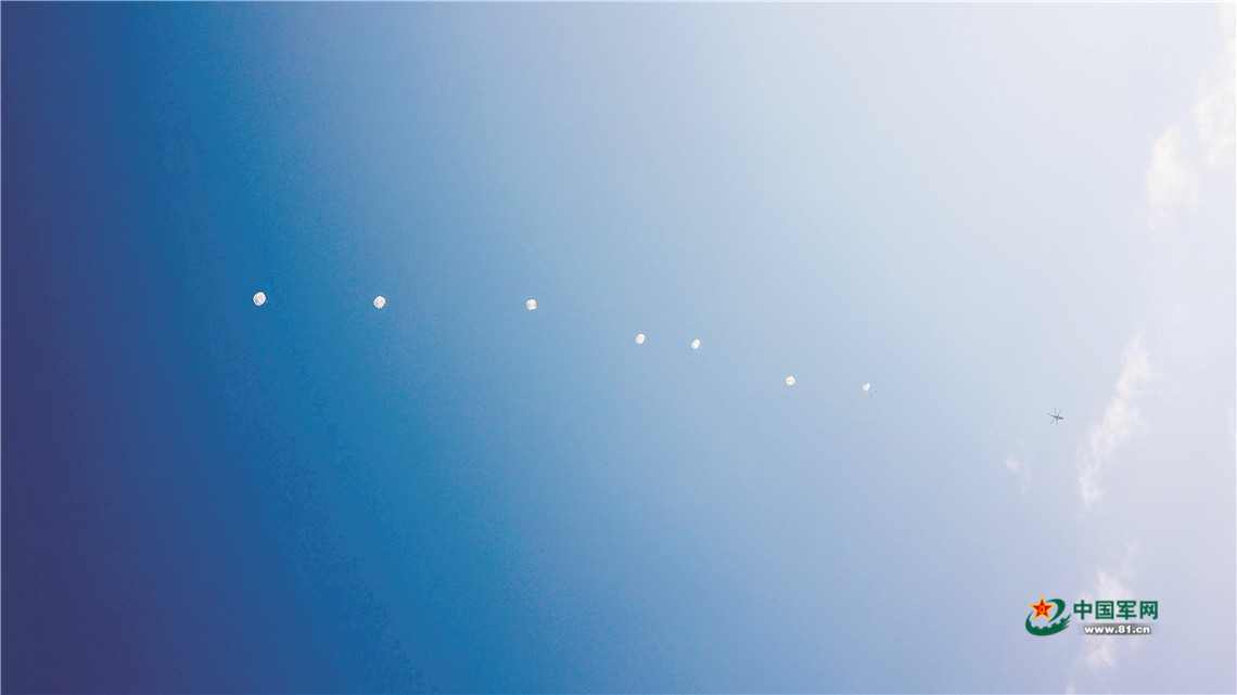 飛機(jī)抵達(dá)預(yù)定空域后,機(jī)上安全員對(duì)官兵傘具背掛情況做最后的檢查。離機(jī)信號(hào)響起,特戰(zhàn)隊(duì)員依次躍出機(jī)艙,朵朵傘花在天幕下競相綻放。數(shù)分鐘后,隊(duì)員們安全著陸,緊接著快速實(shí)施戰(zhàn)斗編組,向“敵”前沿隱蔽滲透。