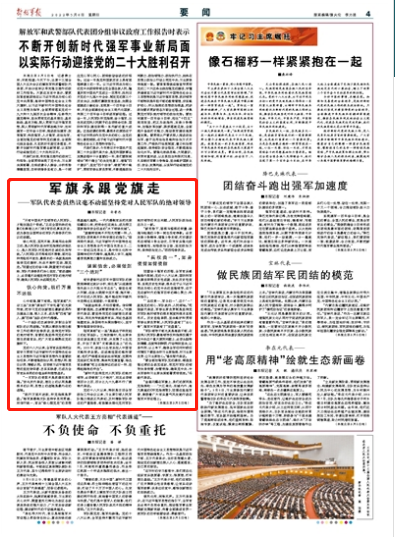 鐵心向黨、至死不渝,英雄用生命捍衛(wèi)的,是人民軍隊堅決聽黨指揮的赤膽忠心,是人民軍隊對黨絕對忠誠的優(yōu)良傳統(tǒng)。“人民軍隊歷盡艱難而不潰散,面對各種考驗而不變色,最根本的一條就是始終高舉黨的旗幟,矢志不渝聽黨話、跟黨走。”回望過往的奮斗路,眺望前方的奮進路,軍隊代表委員們決心堅定,“前進道路上,必須毫不動搖堅持黨對軍隊的絕對領導,確保人民軍隊永遠跟黨走。”
