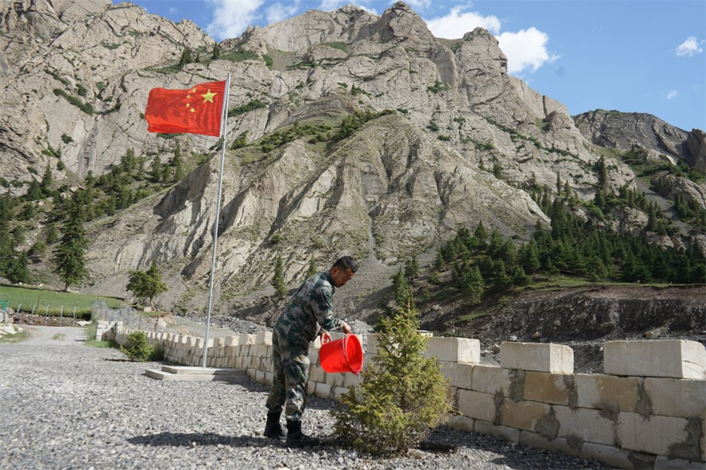 清晨的第一縷陽光透過云層給天山托木爾峰罩上一層朦朧的輕紗,四級軍士長劉強在英沿前哨里像往常一樣開始給營區(qū)的云杉澆水。