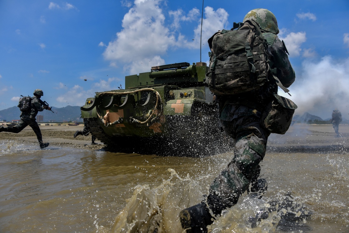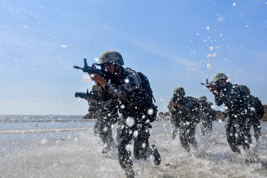 東部戰(zhàn)區(qū)陸軍第73集團軍某旅紅四連官兵進行搶灘登陸訓練(7月28日攝)。新華社發(fā)(劉志勇 攝)