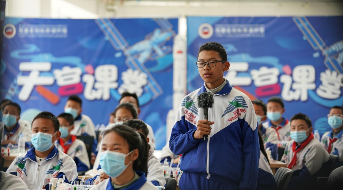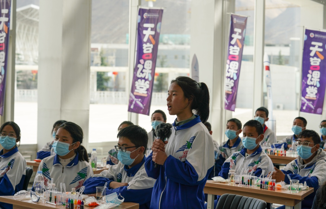 3月23日,在位于拉薩市的西藏自然科學(xué)博物館,學(xué)生代表旦增曲珍向航天員提問。