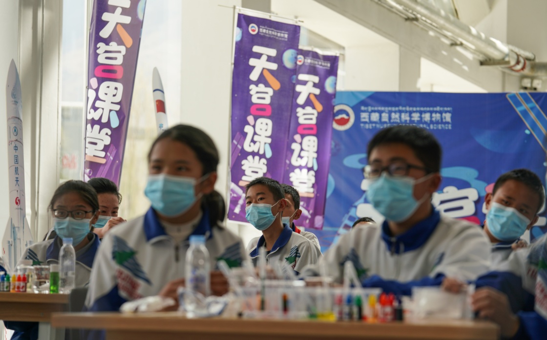 3月23日,在位于拉薩市的西藏自然科學(xué)博物館,學(xué)生代表收看航天員授課。新華社記者 晉美多吉 攝