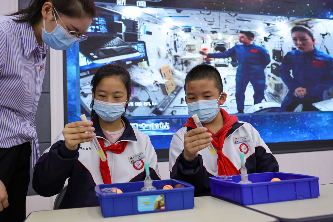 3月23日,在新疆烏魯木齊市第七十中學(xué),學(xué)生觀看王亞平在“天宮課堂”上進(jìn)行液橋演示實(shí)驗(yàn)。新華社記者 丁磊 攝