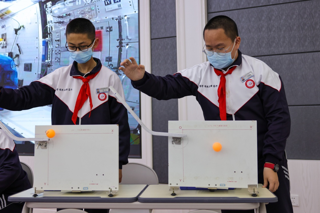 3月23日,在新疆烏魯木齊市第七十中學(xué),學(xué)生收看“天宮課堂”第二課的同時(shí)進(jìn)行拋物實(shí)驗(yàn)。新華社記者 丁磊 攝