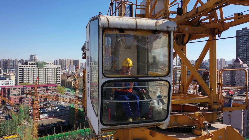 吉克達富正在觀察班組內(nèi)的塔式起重機。新華社記者李紫薇 攝(2022年3月21日)