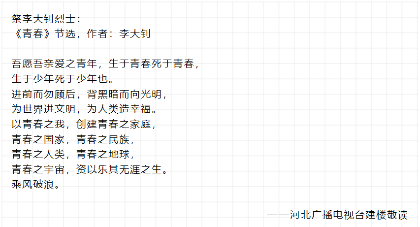 李大釗創(chuàng)建青春中華的理想經(jīng)久不衰,如今青春已被演繹成歌,被當(dāng)代青年傳唱。李大釗一生追求革命真理,追求民族獨(dú)立和人民解放,始終把個(gè)人生死置之度外。他生前曾撰寫名聯(lián)“鐵肩擔(dān)道義,妙手著文章”。