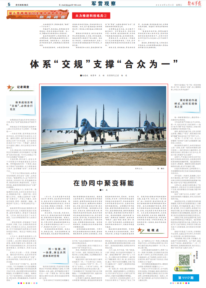 “視角轉(zhuǎn)換、觀念交鋒、目標(biāo)融合,猶如熔爐中迸射的鋼花。這個熔爐,就是體系!”談及此,基地領(lǐng)導(dǎo)說,“一步一個腳印探索,發(fā)揮新體制優(yōu)勢,我們有信心做好‘體系作戰(zhàn)’這篇大文章。”