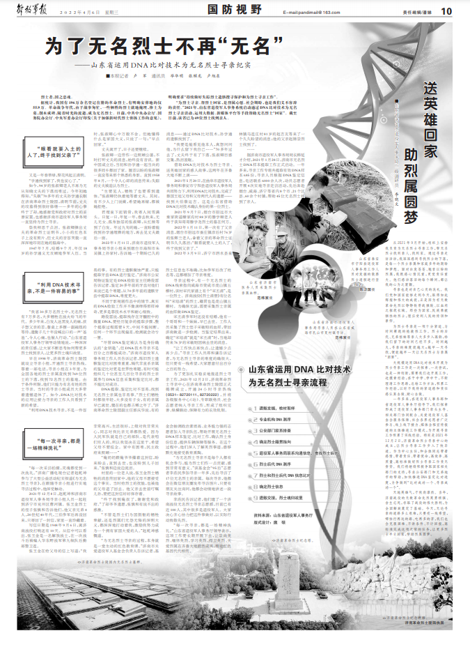 一年多來,在退役軍人事務(wù)部和省退役軍人事務(wù)廳指導(dǎo)下,我們探索形成了退役軍人事務(wù)部門牽頭主導(dǎo)、相關(guān)部門協(xié)同配合、關(guān)愛退役軍人基金會服務(wù)保障、社會各界志愿者廣泛參與、線上線下接力、媒體全程宣傳報(bào)道的立體推進(jìn)工作模式,為開展尋親工作積累了實(shí)踐經(jīng)驗(yàn)。特別是2021年12月2日,濟(jì)南革命烈士尋親中心的成立,讓烈士尋親工作步入了快車道。作為中心主任,和全體同志帶著感情、帶著責(zé)任、帶著使命,高效率、高質(zhì)量、高標(biāo)準(zhǔn)做好烈士尋親工作責(zé)無旁貸。我們將繼續(xù)積極爭取國家相關(guān)部門的支持,尋求公安部門和兄弟地市的幫助,加快推進(jìn)DNA鑒定比對進(jìn)度,力爭做到“比對成功一個(gè)、尋親成功一個(gè)”。