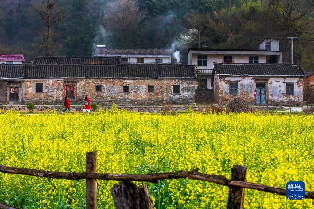 油菜花映襯下的新縣古村落(資料照片)。新華社發(fā)