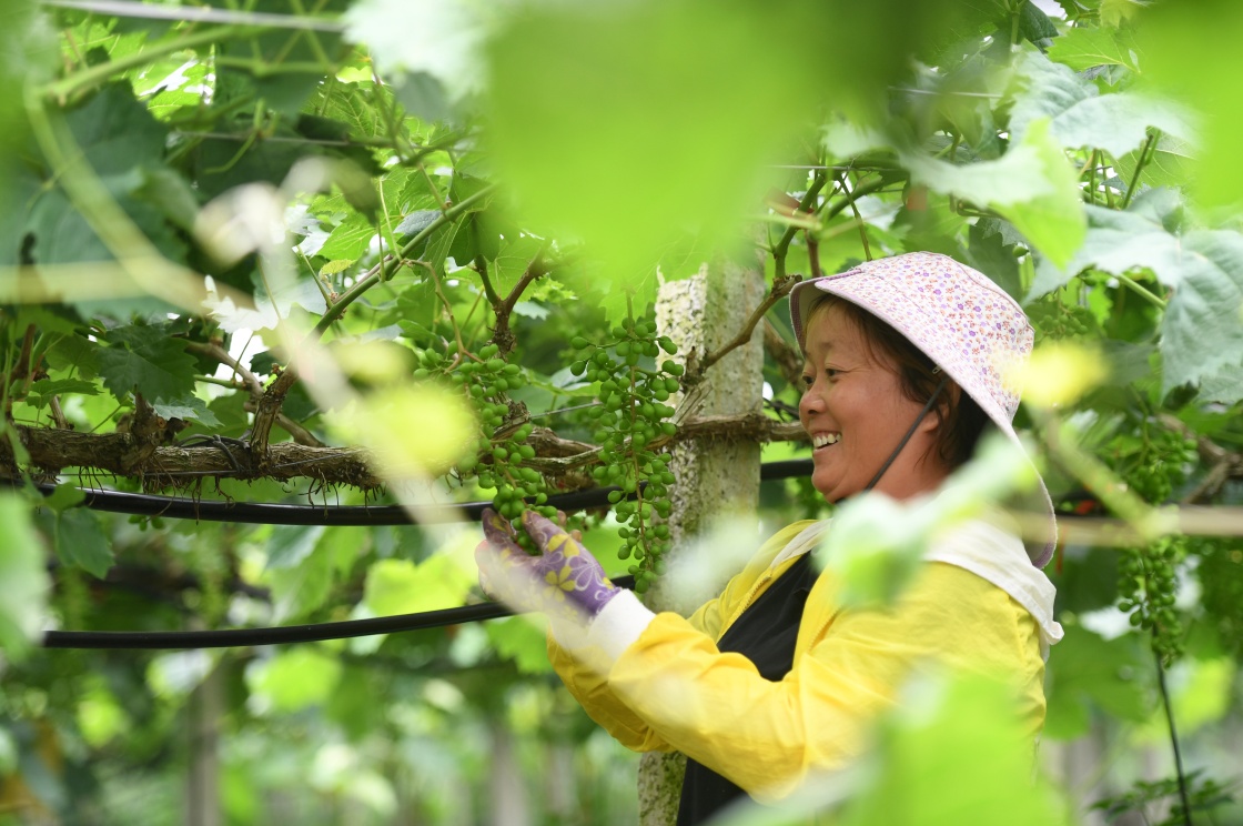 在廣西東蘭縣武篆鎮(zhèn)東里村葡萄園,工作人員在管護(hù)葡萄(5月6日攝)。新華社記者 陸波岸 攝