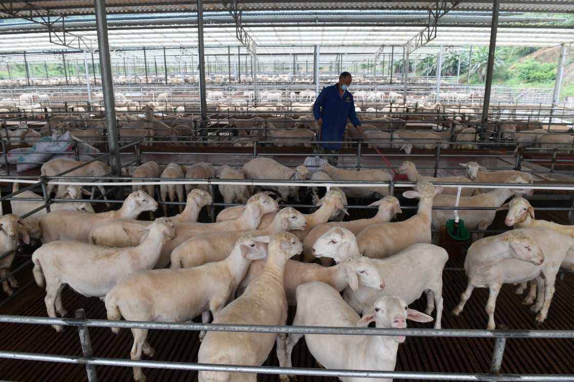 在廣西東蘭縣武篆鎮(zhèn)東里村澳寒羊養(yǎng)殖基地,工作人員在清理羊舍(5月6日攝)。新華社記者 陸波岸 攝