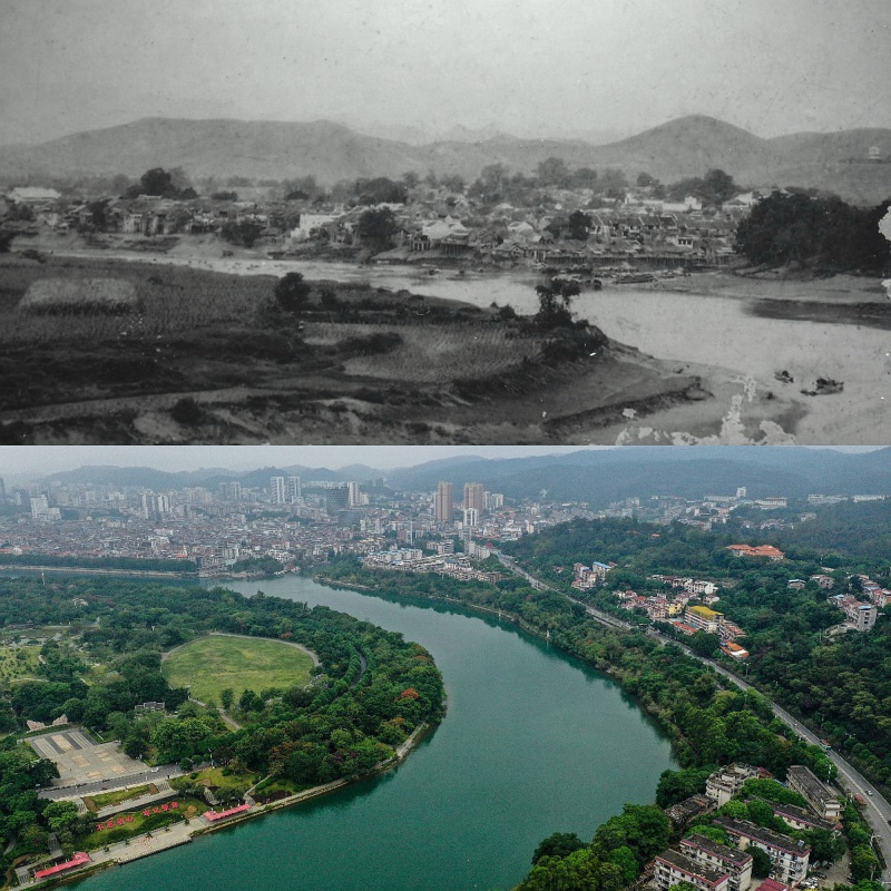 拼版照片:上圖為1917年的百色縣城(資料圖片,百色市檔案館提供);下圖為2022年5月8日拍攝的百色市(新華社記者張愛林?jǐn)z,無人機(jī)照片)。新華社發(fā)