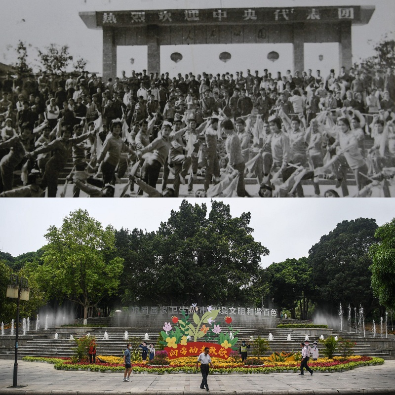 拼版照片:上圖為1978年百色市民在人民公園門前慶祝廣西壯族自治區(qū)成立20周年(資料圖片,百色市檔案館提供);下圖為2022年5月7日拍攝的百色市人民公園正門(新華社記者張愛林?jǐn)z)。新華社發(fā)