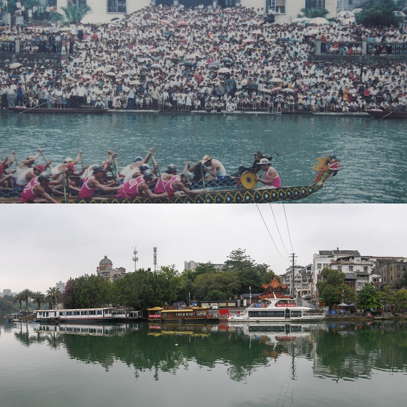 拼版照片:上圖為1990年百色市民在老碼頭賽龍舟(資料圖片,百色市檔案館提供);下圖為2022年5月8日拍攝的百色市老碼頭(新華社記者張愛林?jǐn)z)。新華社發(fā)