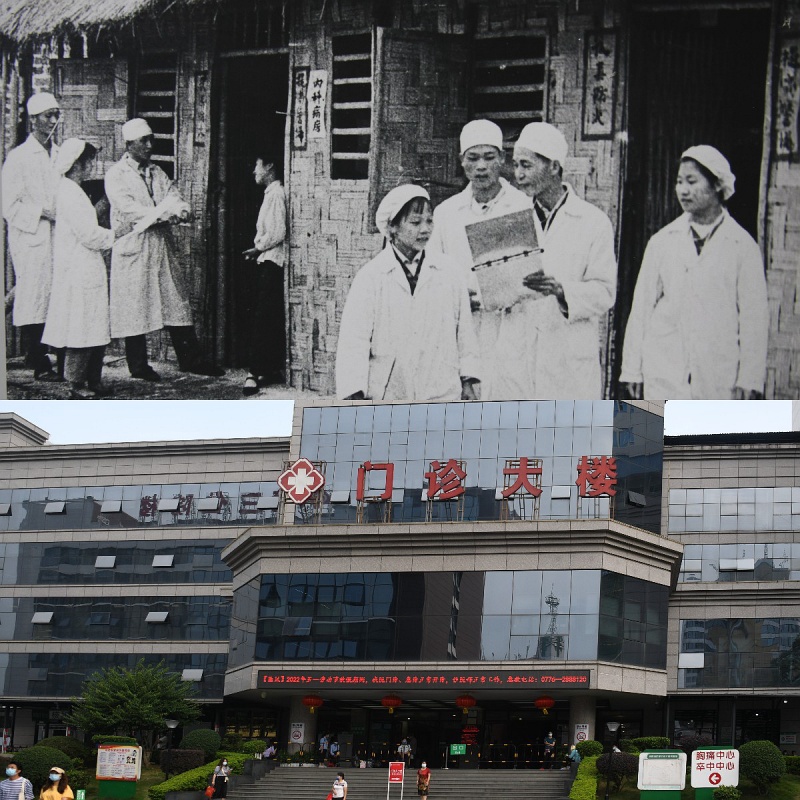 拼版照片:上圖為1951年百色市右江民族醫(yī)院建設(shè)初期場景(資料圖片,百色市檔案館提供);下圖為2022年5月7日拍攝的百色市右江民族醫(yī)院門診樓(新華社記者張愛林?jǐn)z)。新華社發(fā)