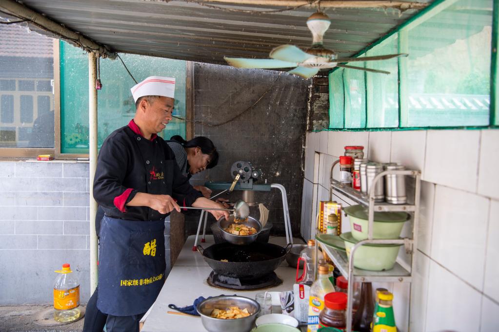 5月18日,在山西省長治市武鄉(xiāng)縣磚壁村,村民張國兵(左)在自家的農(nóng)家樂里為客人準(zhǔn)備飯菜。新華社記者楊晨光攝