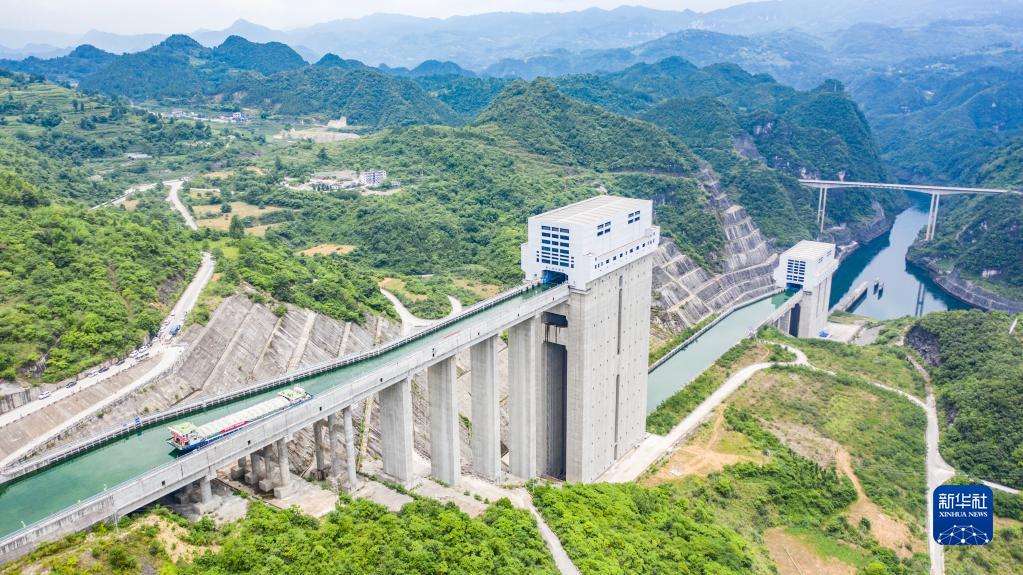 2021年6月投入試運(yùn)行的構(gòu)皮灘水電站配套的通航工程,被視為貴州通江達(dá)海的關(guān)鍵。構(gòu)皮灘通航水頭高差達(dá)199米,采用三級(jí)垂直升船機(jī)運(yùn)行,船只通過烏江構(gòu)皮灘水電站都要搭乘“水上電梯”,呈現(xiàn)出“水在空中懸,船在天上行”的奇景。