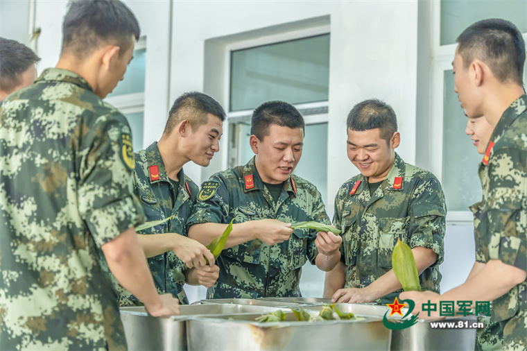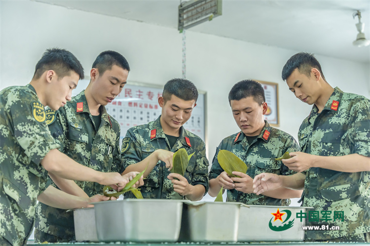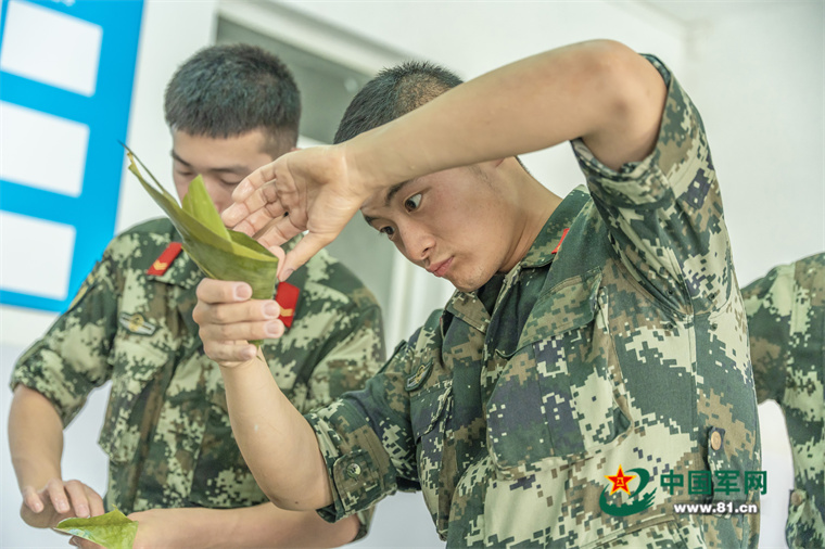 戰(zhàn)士們一起認(rèn)真包粽子。王良 攝