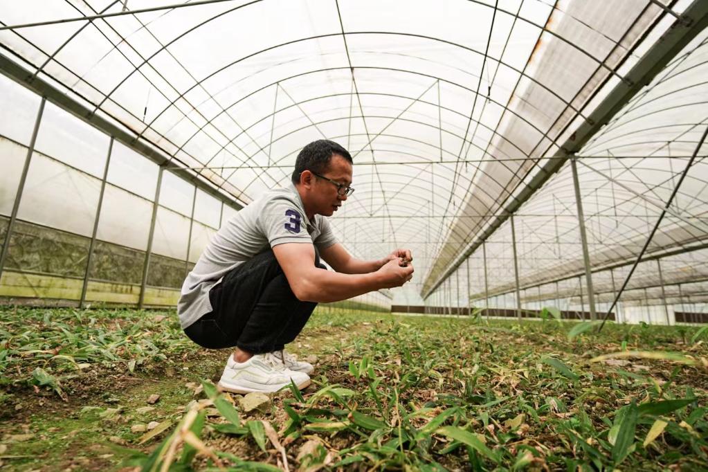 葉茂正在查看黃精長勢。新華社記者朱高祥攝
