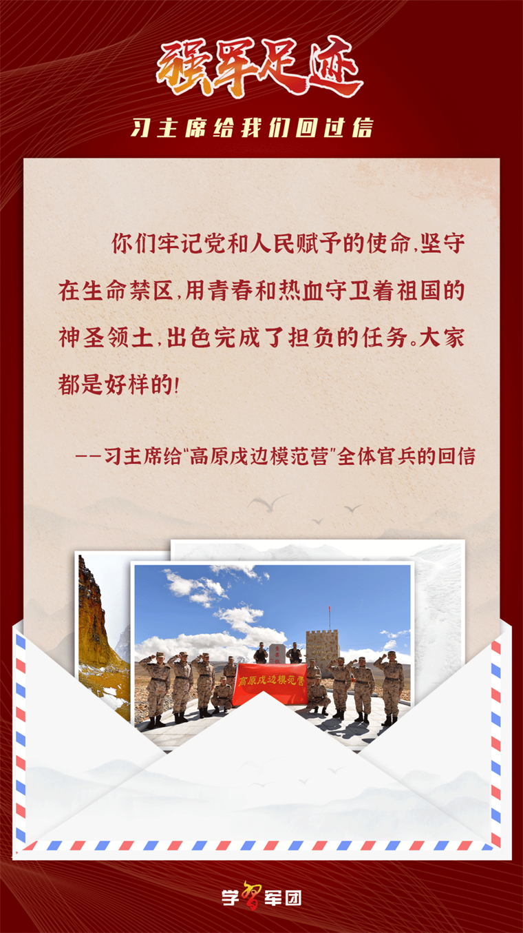 習(xí)主席回信勉勵(lì):你們牢記黨和人民賦予的使命,堅(jiān)守在生命禁區(qū),用青春和熱血守衛(wèi)著祖國的神圣領(lǐng)土,出色完成了擔(dān)負(fù)的任務(wù)。大家都是好樣的!