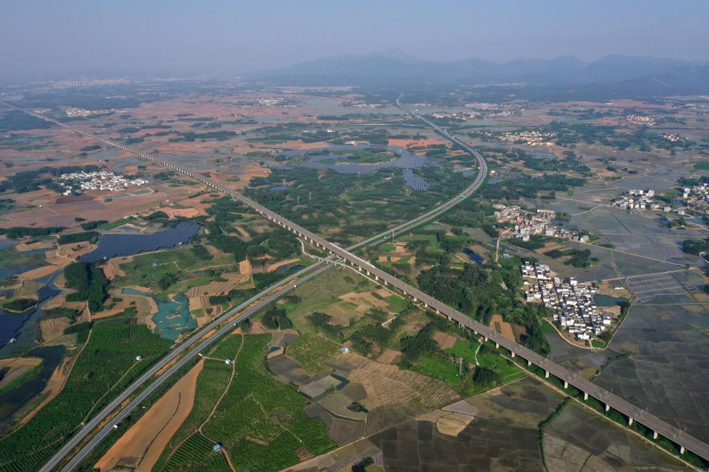 南廣高鐵和蒼碩高速在廣西賓陽(yáng)縣古辣鎮(zhèn)交會(huì)(無(wú)人機(jī)照片,4月4日攝)。新華社記者黃孝邦攝