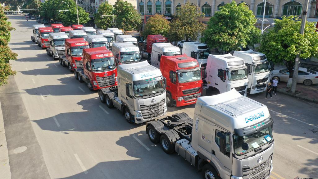重型卡車在龍州縣水口口岸等待通關(guān)出口。(龍州縣融媒體中心供圖)