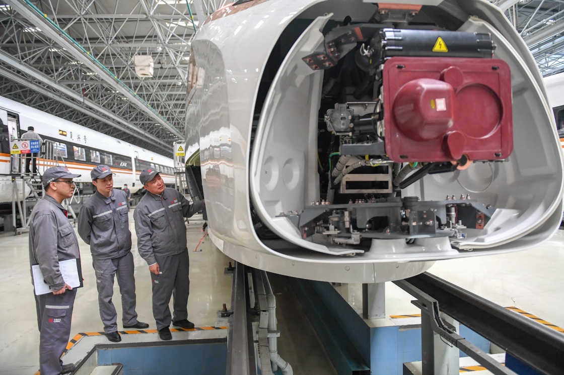 在吉林省長春市中車長春軌道客車股份有限公司高速動車組制造中心調(diào)試車間,首席技能專家羅昭強(qiáng)(右一)與同事檢查復(fù)興號高鐵列車的電氣系統(tǒng)(2020年11月25日攝)。新華社記者 張楠 攝