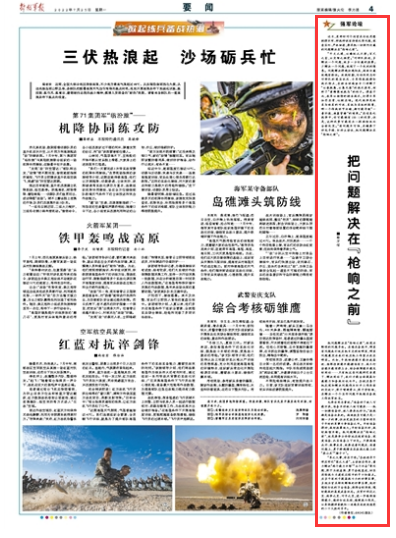 近日,某部針對(duì)個(gè)別官兵打仗思想樹(shù)得不牢、研戰(zhàn)研訓(xùn)有待深化等問(wèn)題,深查實(shí)糾、嚴(yán)抓細(xì)摳,要求把一切制約打贏的問(wèn)題解決在“槍響之前”。
