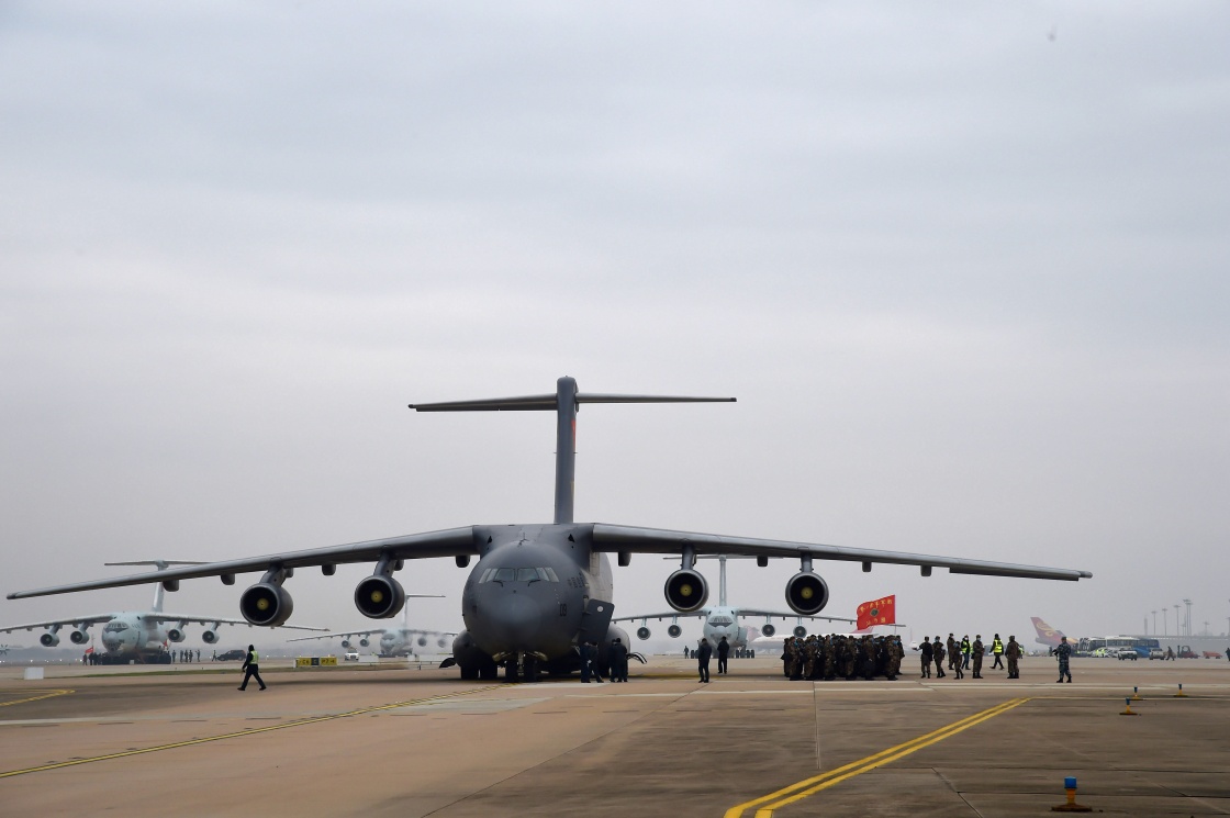 空軍出動(dòng)3型11架運(yùn)輸機(jī)多地同步向武漢空運(yùn)醫(yī)療隊(duì)員(2020年2月13日攝)。新華社記者 黎云 攝
