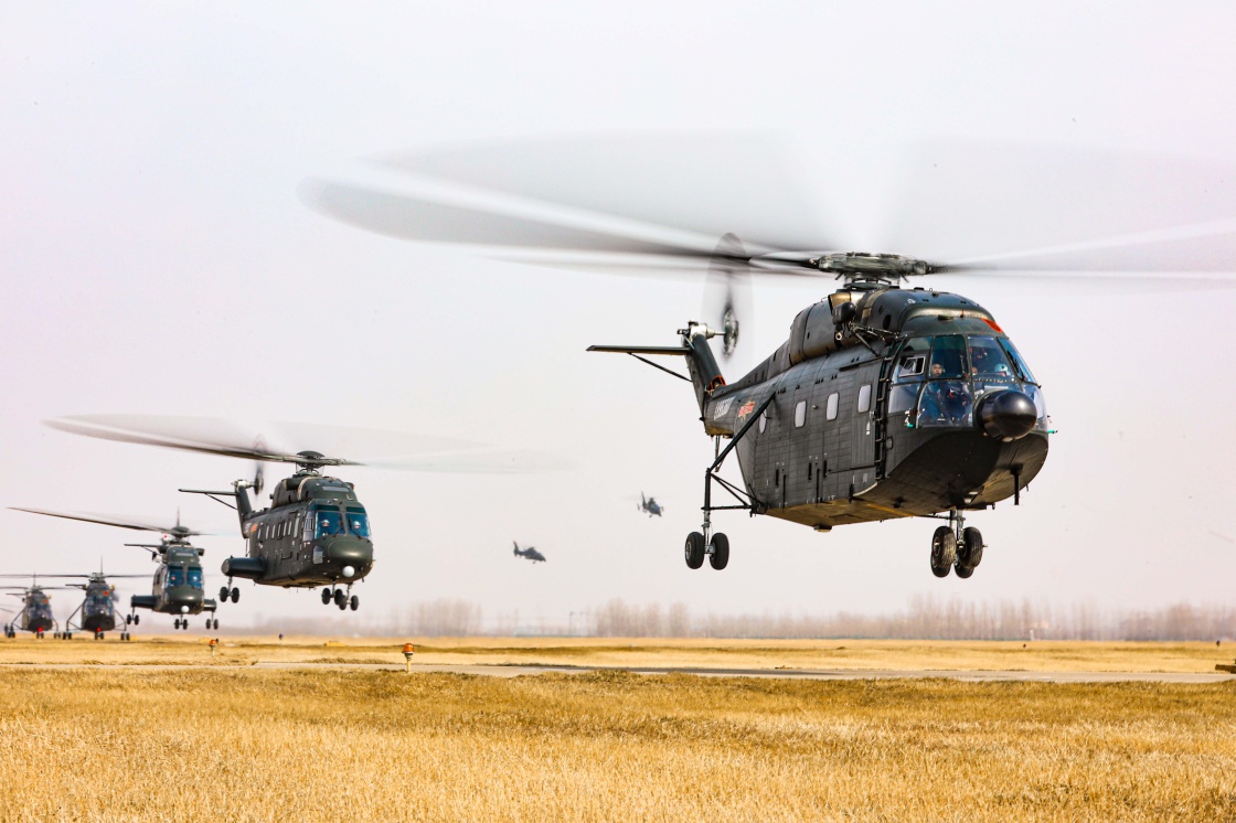 北部戰(zhàn)區(qū)陸軍第80集團(tuán)軍某陸航旅攻擊直升機(jī)與運(yùn)輸直升機(jī)組成大機(jī)群編隊(duì)進(jìn)行跨晝夜飛行訓(xùn)練(2022年2月11日攝)。新華社發(fā)(劉雨辰 攝)